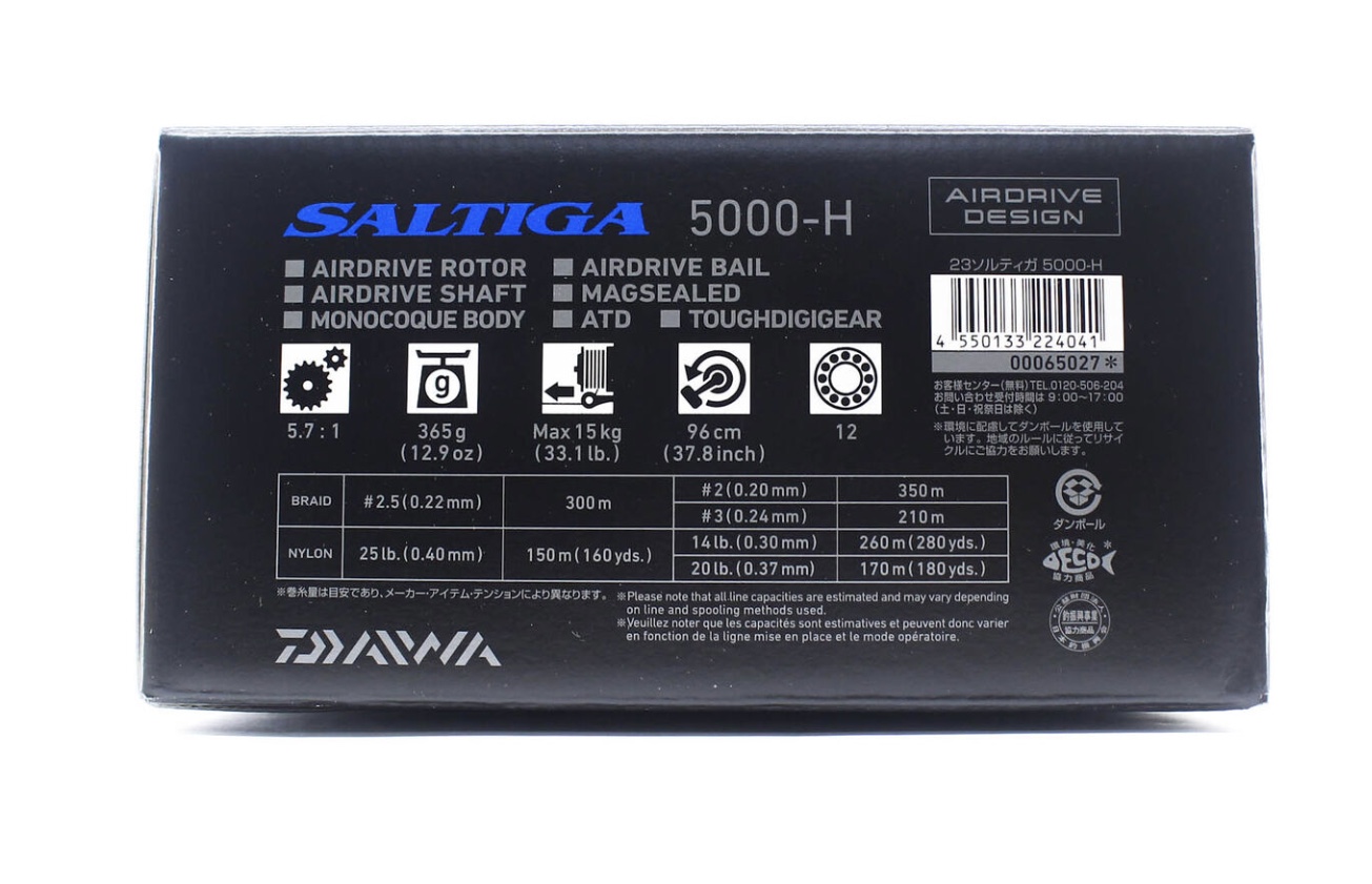 Совершенно обновленная, высокотехнологичная и невероятно мощная катушка Daiwa 23 Saltiga создана для ловли крупных морских и пресноводных хищников таких как: амберджек, желтохвост, морской окунь, чавыча, таймень и сом. 23 Saltiga 4000/5000/6000 сделала большой технологический прорыв по сравнению с предыдущими катушками в серии спиннинговых катушек среднего размера для морской воды.