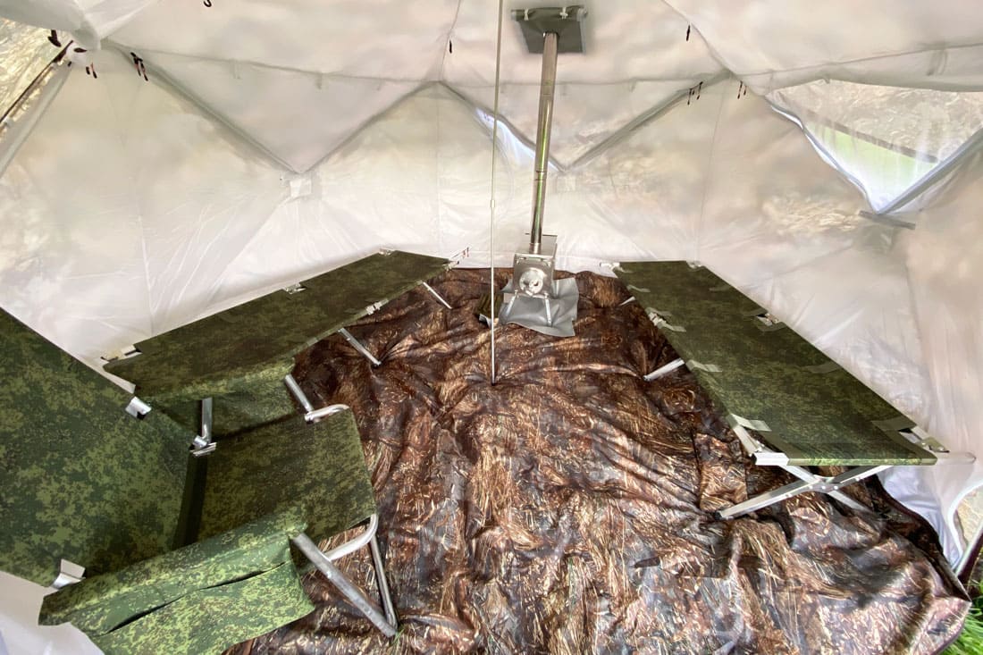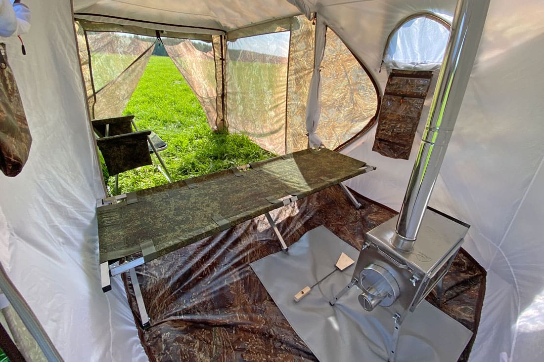 Складная конструкция и вес 7 кг позволяет с легкостью использовать раскладушку в палатке на зимней рыбалке.