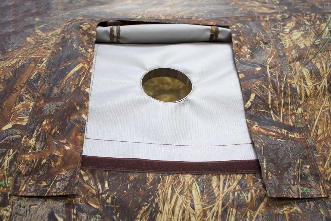- Двумя дымоходами для установки печей. Два дымохода позволят установить печь для походной бани в каждой секции. Дымоход состоит из комбинированных материалов: термостойкая кремнеземная ткань и кольцо из жаропрочной нержавеющей стали, которое фиксирует трубу печи в неподвижном состоянии;