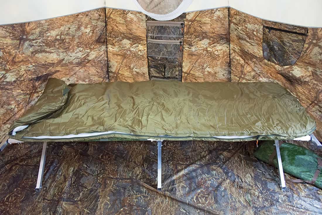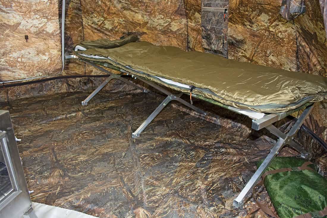 Стандартная комплектация палатки УП-2 включает в себя пол, который пристегивается выше поверхности земли, что предотвращает обмерзание молнии в мороз и доступ влаги во время дождя. Пол при необходимости полностью отстегивается.
