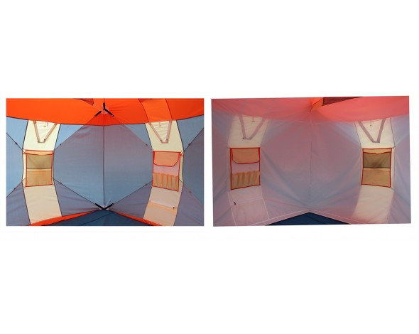 Основное отличие люксовой версии - наличие внутреннего съемного дышащего тента, делающего палатку еще теплее. Внутренний тент изготовлен из уникальной полиэфирной ткани с дискретным покрытием, рекомендованной к использованию МЧС России. Она: